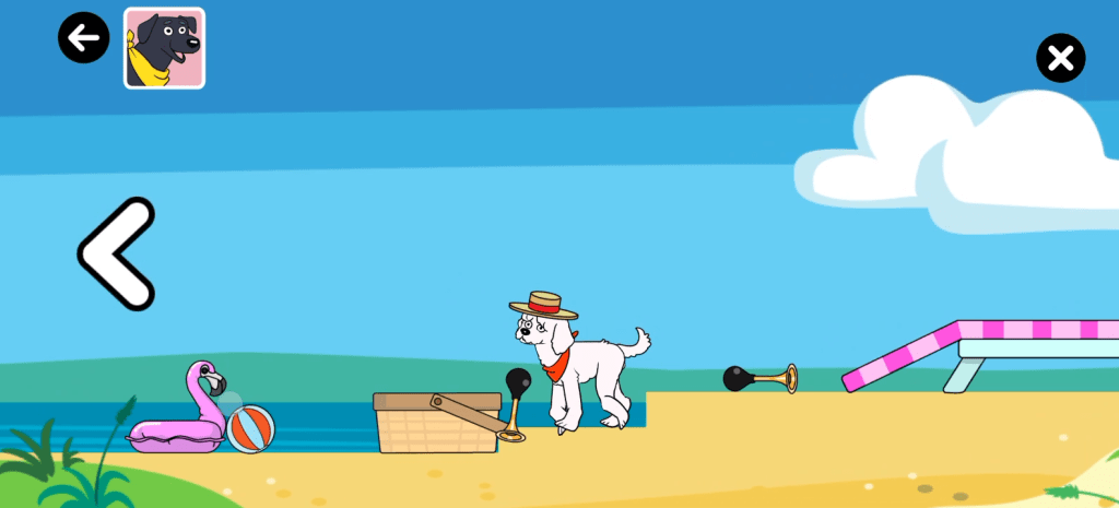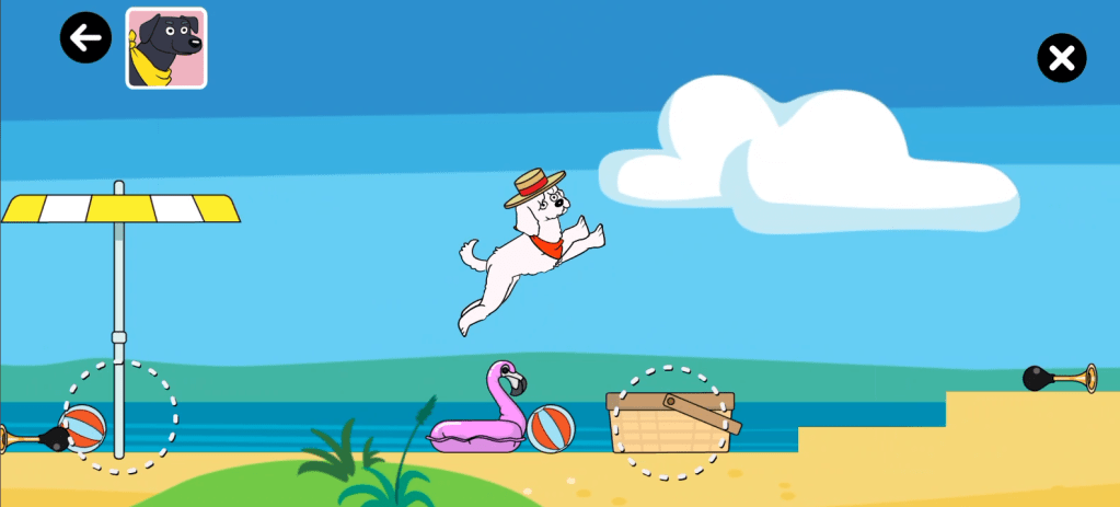 In the game you are guiding three dogs through missions: trying to experience what kids do in their everyday life. The game takes place in the dog den plus three other locations; Music Class, beach and supermarket. Each location has objectives and items that the dogs can interact with; toys, vases, trashcans, musical instruments, sprinklers, fans, mud, etc. The game is based on the TV series of same name.
