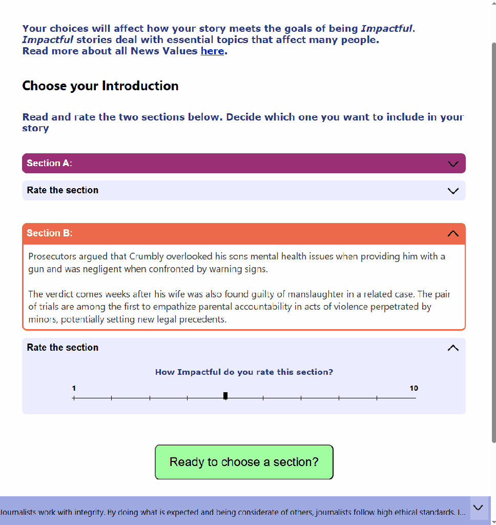 News Arcade is a web-based gamified experience about creating News Articles. It is meant to inspire the youth to write their own news articles by selecting different pieces of pre-written text and combine them into a news article. The different pieces of text will have different keywords attached to them and the goal of the game is to make an article that matches a specific keyword like inspiring or analyzing. That way it gives an understanding of the effects journalists use when writing a piece for an online audience.