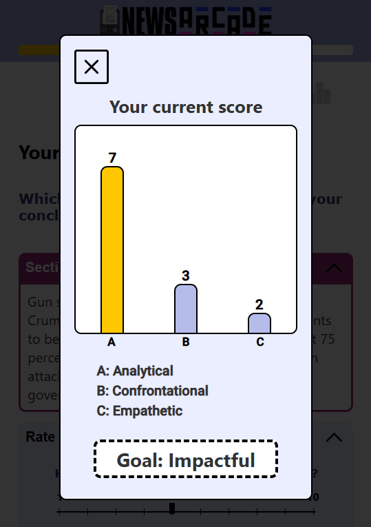 When selecting a statement and having received feedback, when continuing to the next page a pop-up will appear showing the combined points per keyword you have received so far. This is to give the player an idea of how close they are to making an article that has the correct keyword. A bar diagram coded in JavaScript was used for this. Depending on whether the player gets most points in the correct keyword or not, the final page will be displayed with either green or red and with customized feedback.