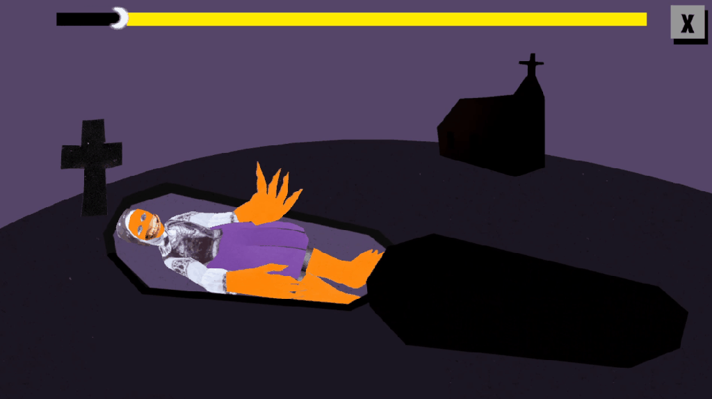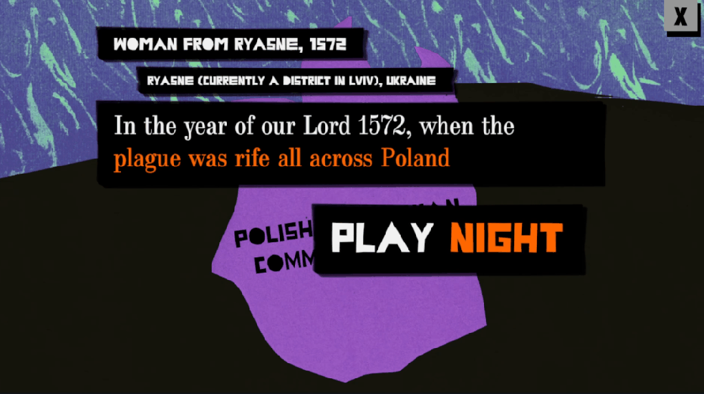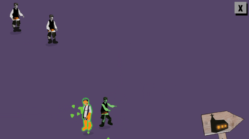 The game is based on stories from the book “Upiór” by author Łukasz Kozak. The book is a collection of stories told by people who believed in different folklore monsters. The Upiór is similar to vampires, and that is where the name “Real Vampires” comes from. The game is a collection of mini-games inspired by quotes from the book. In the game, you play as both a human, hunting vampires and a vampire trying to escape from humans. The graphic style of the game features cut-out images with purple and orange pieces, with orange symbolizing the vampire and purple symbolizing the humans.