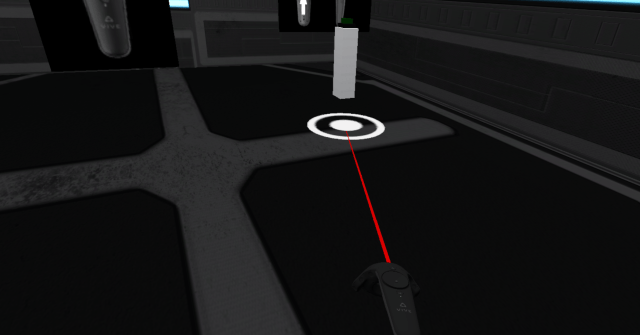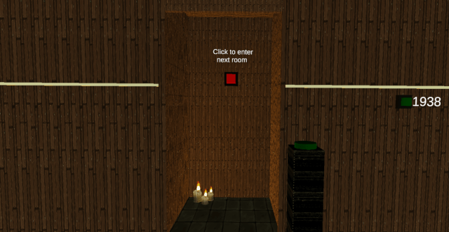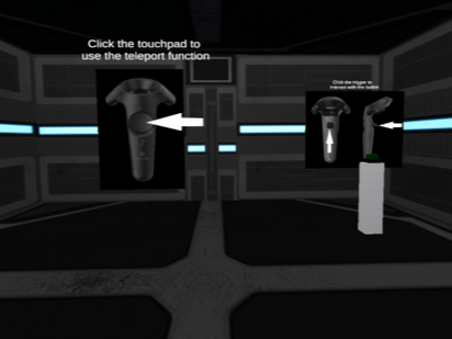 In this first room two images were placed in the middle of the room explaining the controls of the HTC Vive and a button to press. The application was to be tested on people who may or may not have used a VR headset before. When the player had used the teleportation function and clicked the button with the controller a door to the next room would open. This door was a 3D objects which would slide to the slide when the button was clicked.