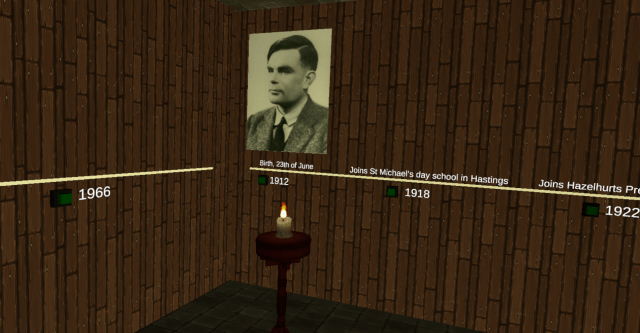 The second room had a timeline along the walls. Below the timeline was buttons with a year written next to it. The years symbolized important events in Alan Turing’s life and when pressing the button, a short line of text would appear above the timeline and an audio file would play.and play. explaining the event in more detail.