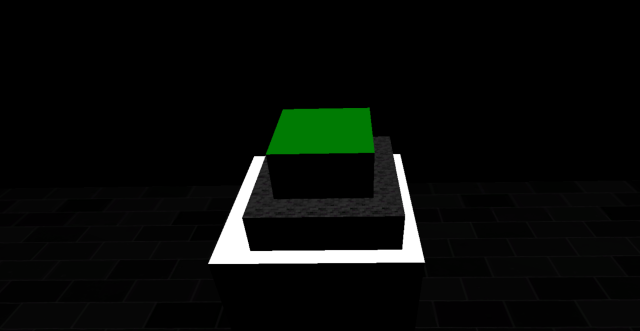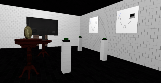 When entering this room only a button placed on a pedestal would be illuminated. Once pressed a spotlight would turn on, on a nearby image and an audio file with information about the Turing test would play.When entering this room the player would be in complete darkness except for one button placed on a pedestal which would be illuminated. Only one button would be lit up. When the user pressed the button a screen on the wall would be lit up and an audio would play explaining what the user was seeing and a new button would light up. Clicking this button would light up a picture and another audio would play explaining what was on the picture. This room would explain the Turing test and when all buttons had been pressed the room would light up to show all the buttons and items that had been explained giving the user free reigns to rehear the audio and look at the different objects in the room.