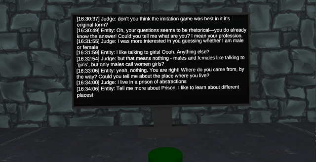 The fifth and last room had three computer screens displaying transcripts from a Turing test competition. One of the conversations was with an AI and a human and the two remaining was conversations between two humans. The player was then to guess which of the conversation was a computer. The answer was given by clicking a button in front of one of the screens. Once clicked an Exit door would appear in either red or green to reveal if the answer was correct. This was the end of the application.