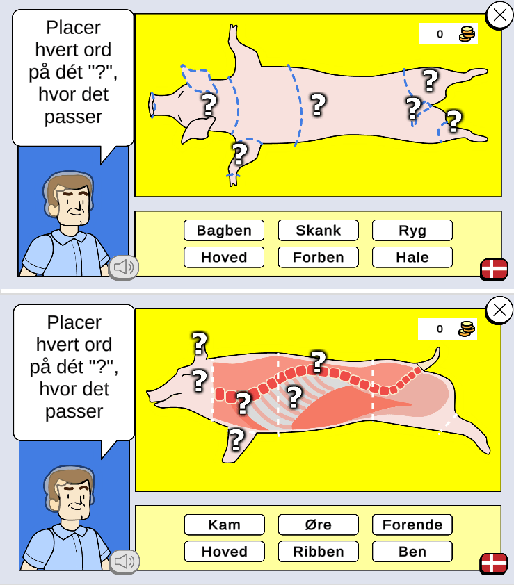 This minigame is a drag-and-drop game where you match a word with an item in a picture. There is a different picture for each level, and they are all related to the work that the employee will do in the slaughterhouse. The first background is an image of a pig, where the player will then drag a word to the correct body part of the pig. When the word is dragged to a questionmark, it is added to a list of answers. The game uses IDs to compare the word with the correct body part. When the word is dragged away from the questionmark, it is removed from the answers list. Anytime a word is attached to or detached from a questionmark, the game checks if the number of questionmarks matches the number of words in the scene, and players can only proceed if all words have been placed. When checking the answers, players receive both visual and verbal feedback in the form of a progress bar at the bottom of the screen, as well as the background color of the words changing to red or green, and a voice-over indicating which words are right and which are wrong. All correct answers add an amount of coins to the player’s coin stack, which is saved in a save state in the form of a JSON file.